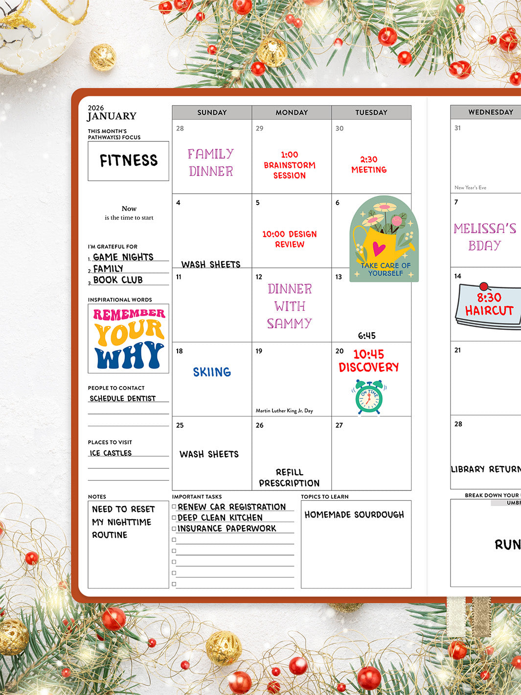 Plan your month with a spacious calendar, guided goal-setting prompts, and reflection space. These pages help you map priorities, track progress, and plan with clarity.