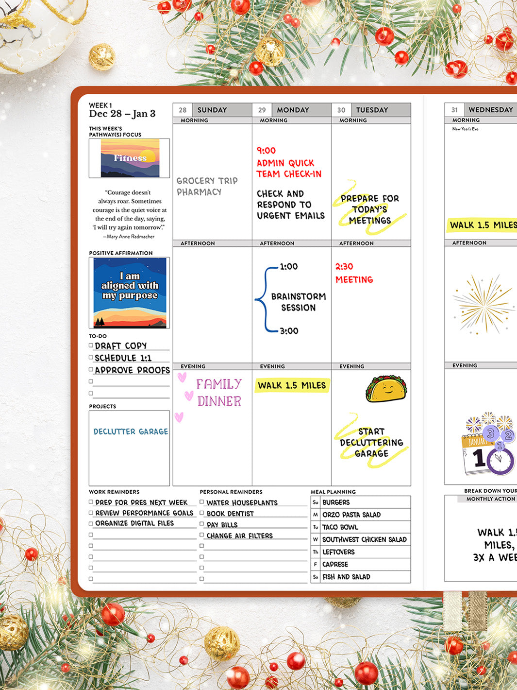 Each week is organized into morning, afternoon, and evening blocks, helping you stay grounded, prioritize what matters, and make time with intention.