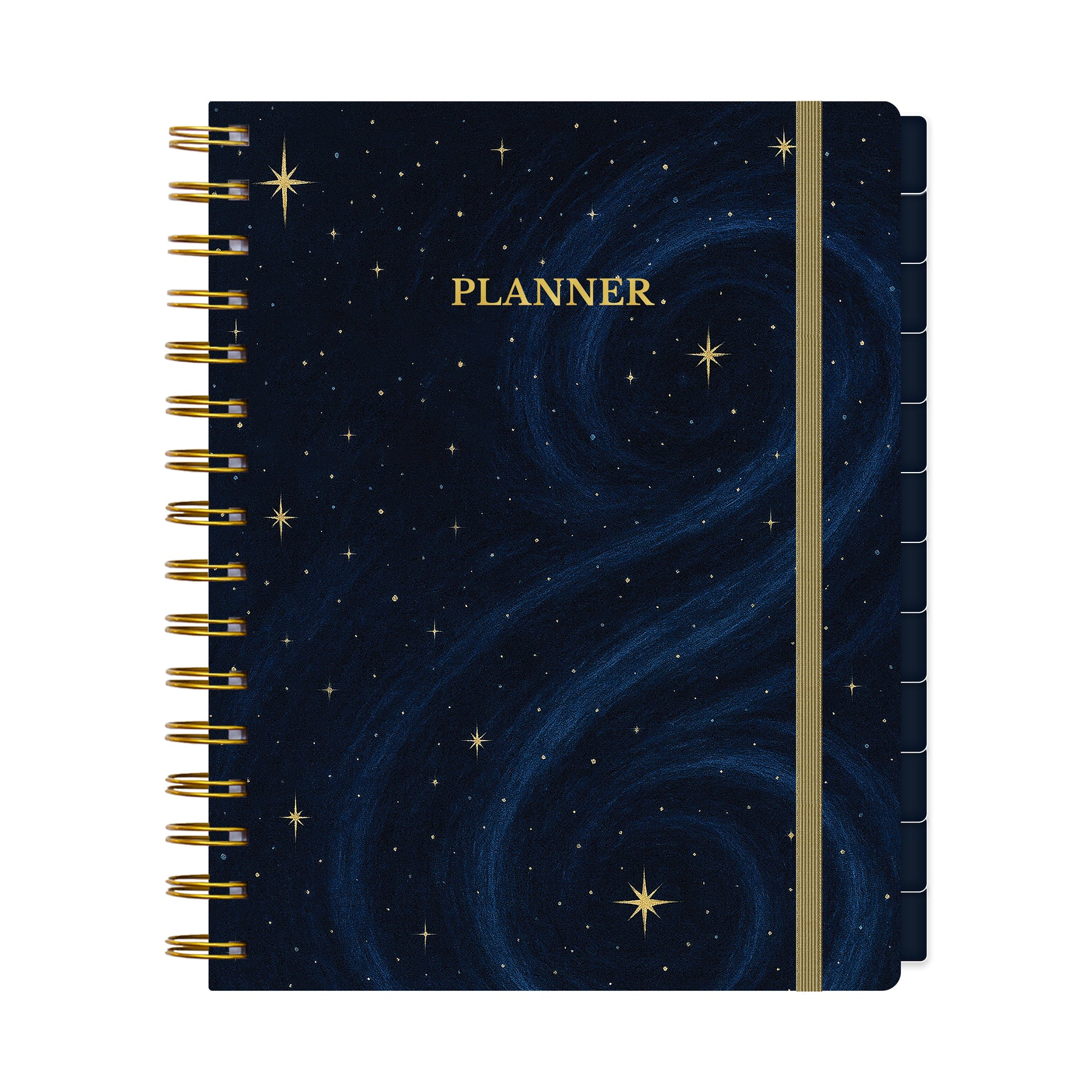 Planner with starry night design and gold spiral binding on a white background #color_midnight-galaxy