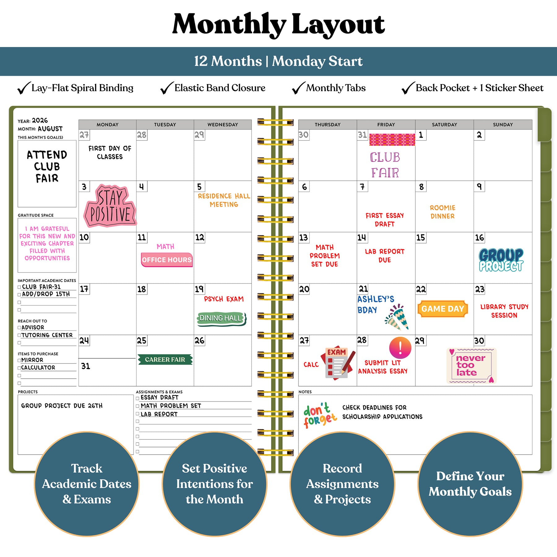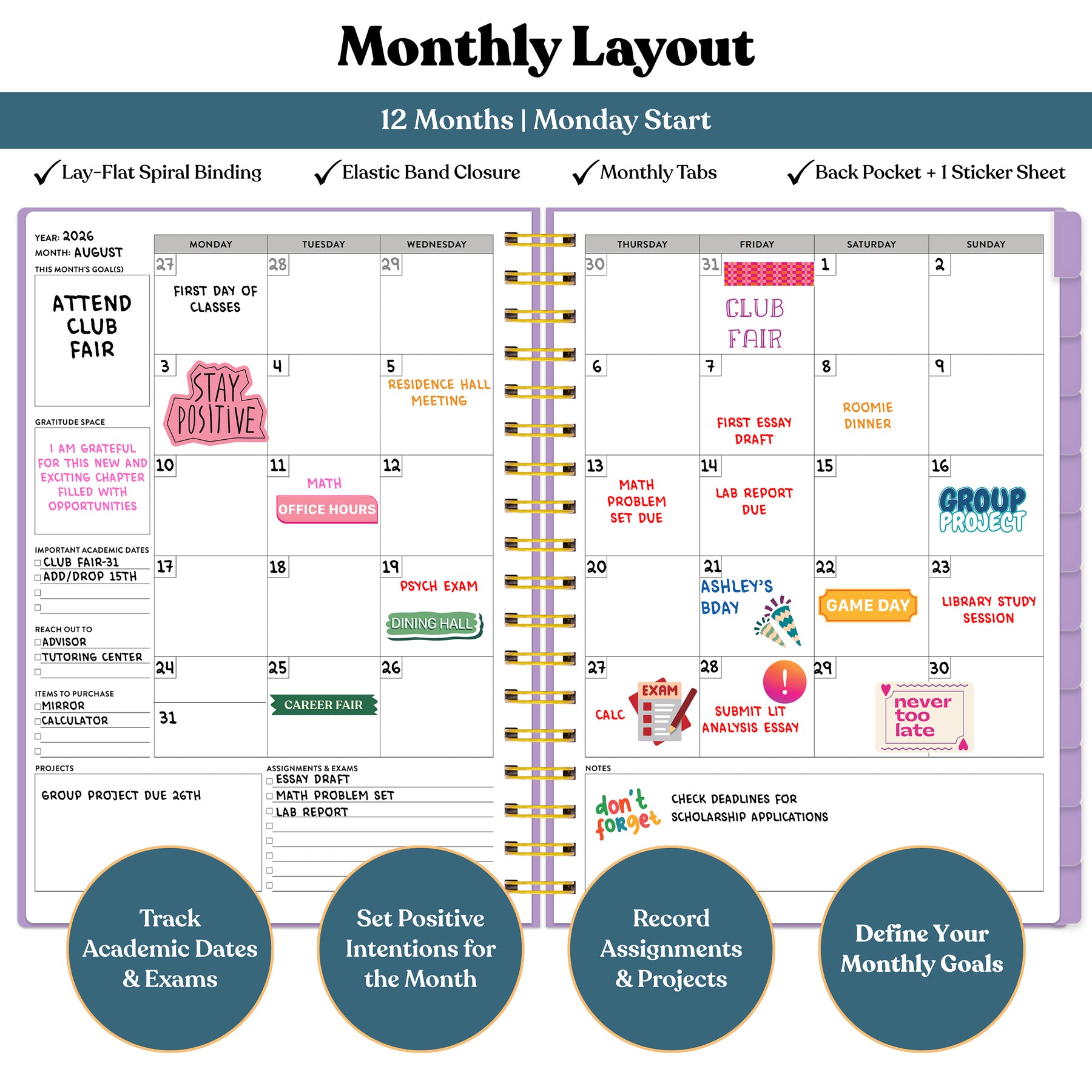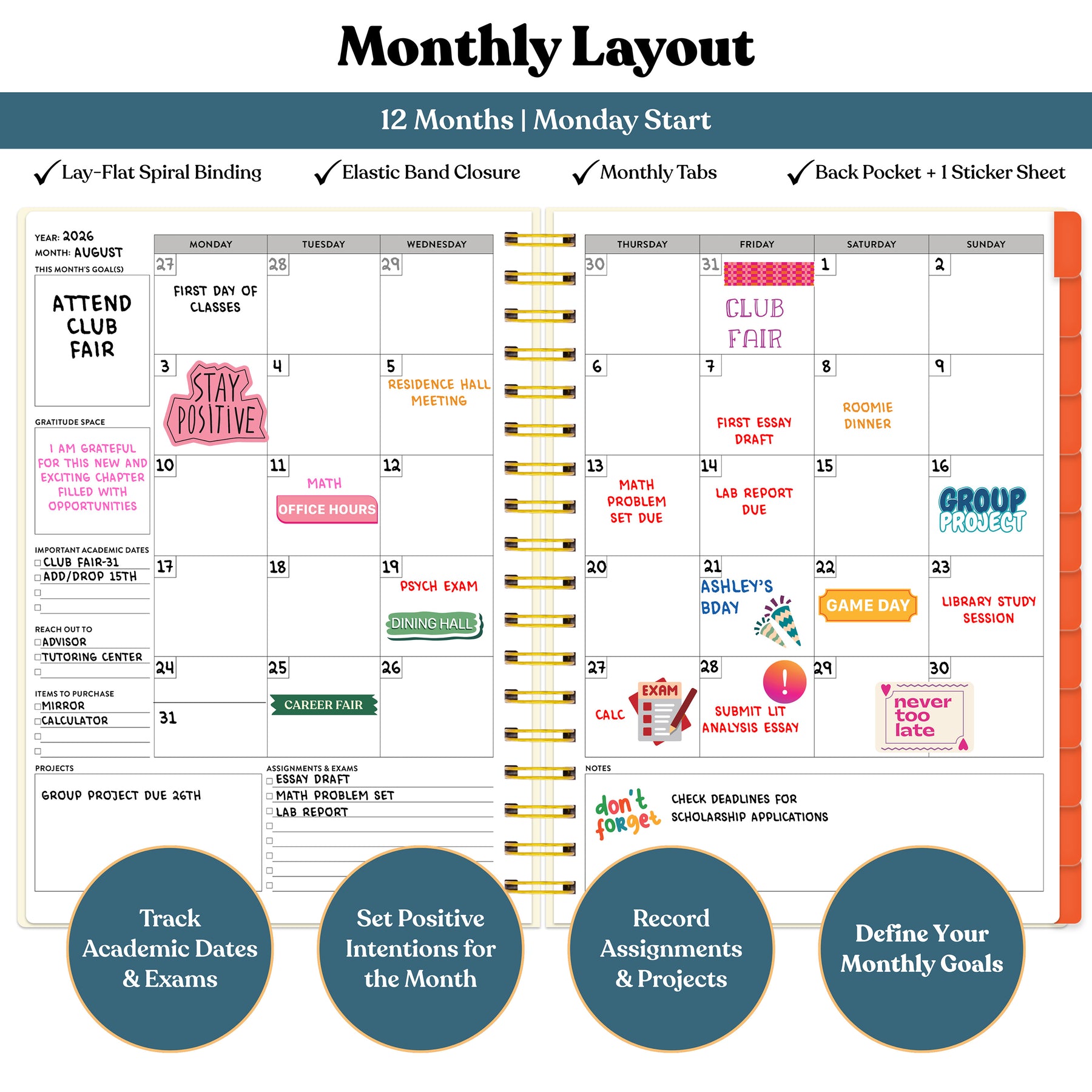 Each monthly layout features a clean calendar view with space to track academic deadlines, exams, and events — plus guided prompts to set goals and reflect on your progress throughout the school year..