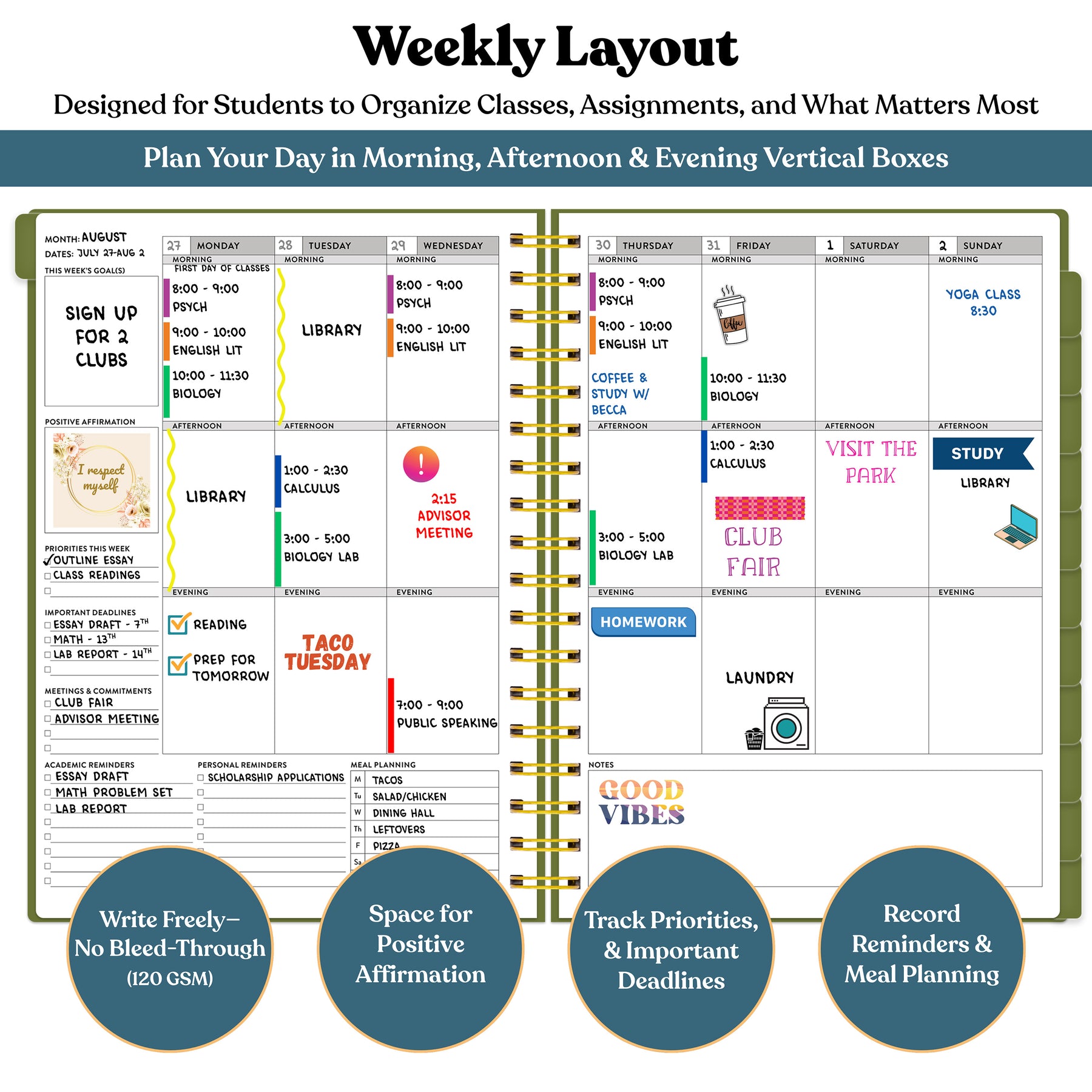 Plan your week with structured morning, afternoon, and evening sections — perfect for organizing class schedules, study sessions, and extracurriculars. Each spread includes space for notes, affirmations, and personal check-ins.