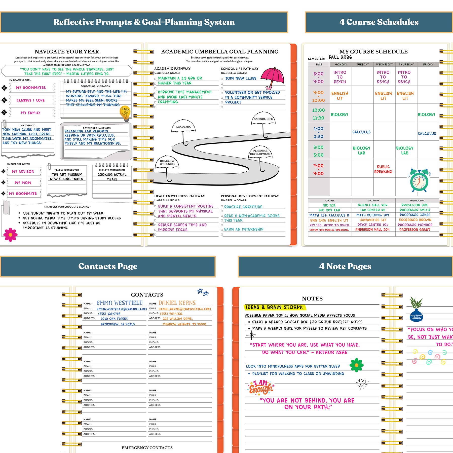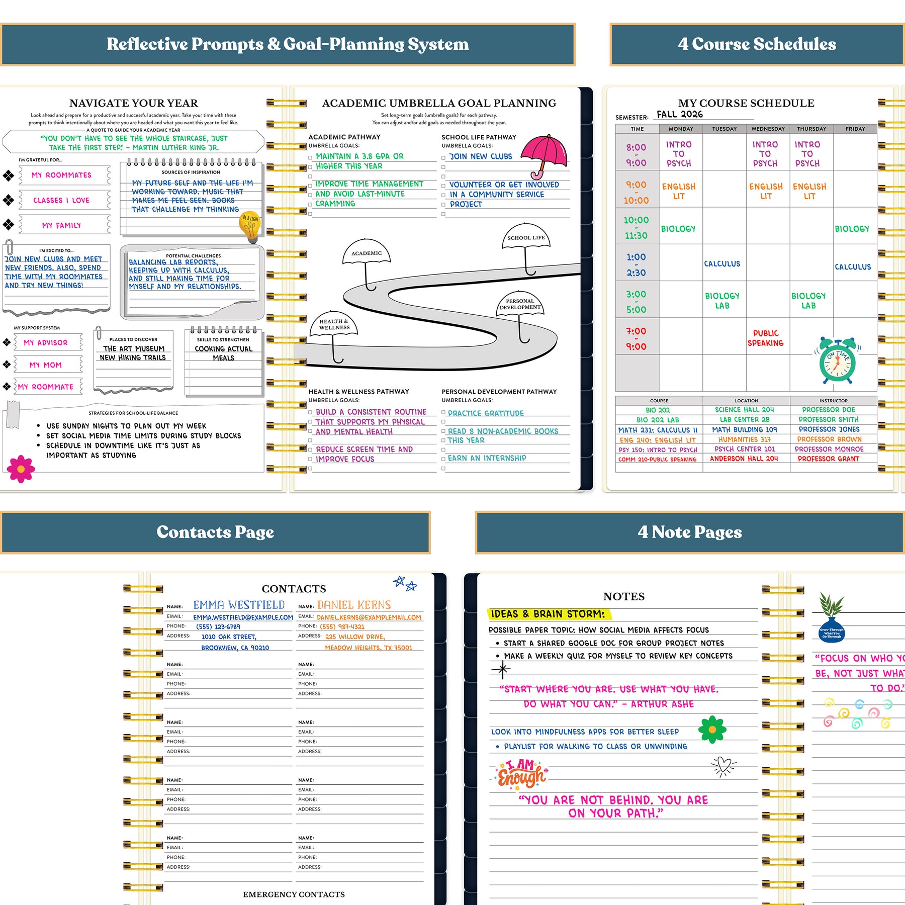 Multifunctional planner with reflective prompts, goal planning, course schedules, contacts page, and notes pages. #color_morning-glow